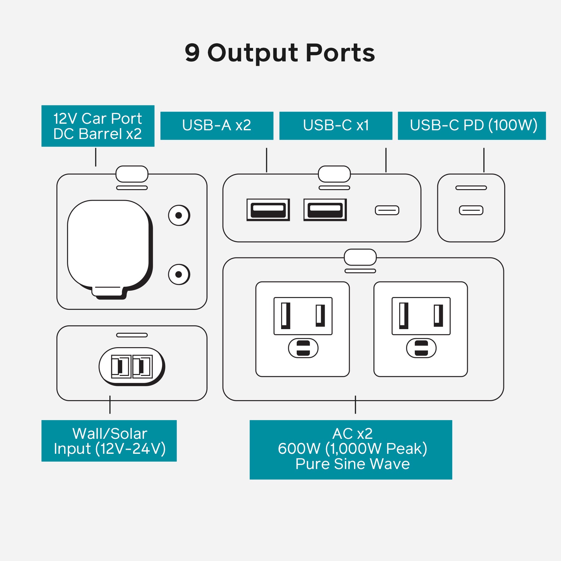 1. All of the essential ports: AC x2, 12V car port, 12V barrel port x2, HPP wall/solar input, USB-C PD, USB-A x2, USB-C x1.