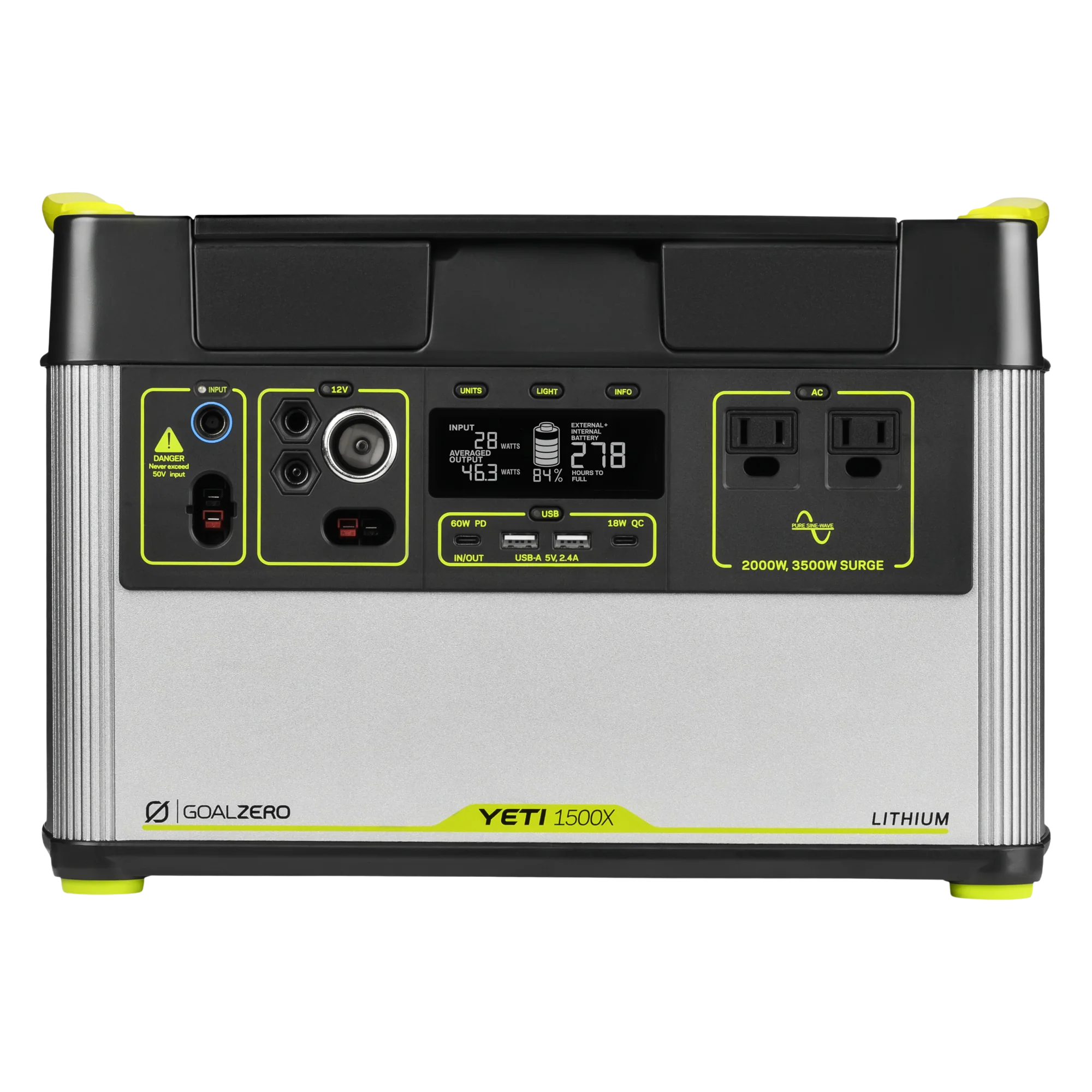 Recharge from the sun by connecting a compatible solar panel. Charge times are dependent on the size of the solar panel. The Boulder 100 Briefcase will provide 100W of solar and fully recharge the Yeti 1500X in 18-36 hours of sun.